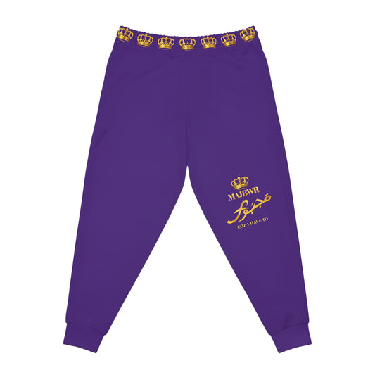 MAJBWR Royal Script Athletic Joggers — Purple & Gold AOP
