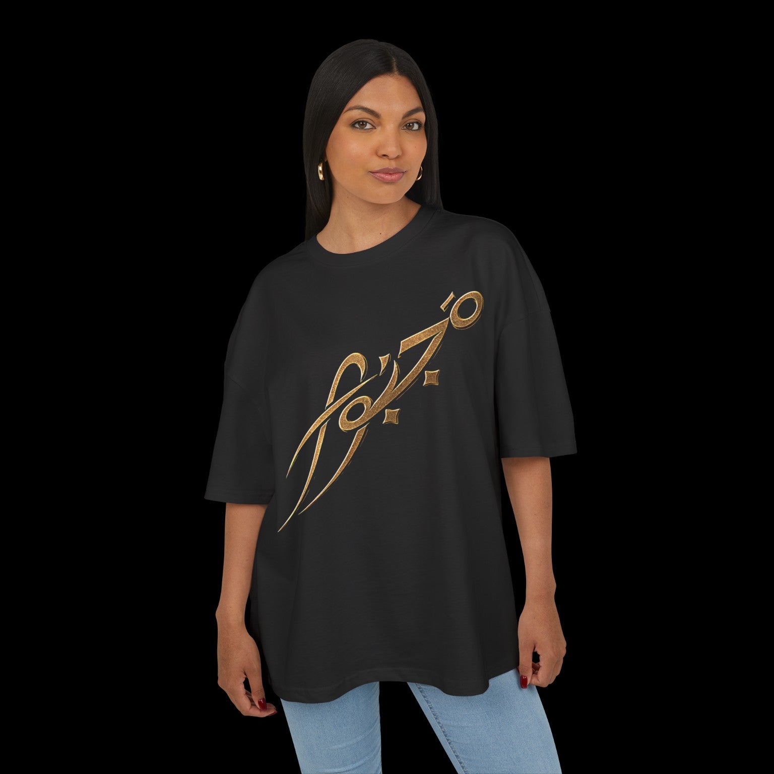 This oversized box tee in striking gold and black feels like stepping into an artful night — bold lines, confident presence. The heavy, substantial cotton drapes with a relaxed, dropped-shoulder silhouette that reads casual but considered. Wear it with high-waist denim, layered over a long-sleeve, or under a leather jacket; it holds shape and color, so the graphic stays sharp and the fit keeps its edge. The slightly cropped, boxy body creates modern proportions that sit just right for people who favor streetwise comfort and simple, graphic statements. Each stitch — from the sewn-in neck to the side label — is finished with care, so the tee feels lived-in from the first wear but built to last through many rotations in your wardrobe.
