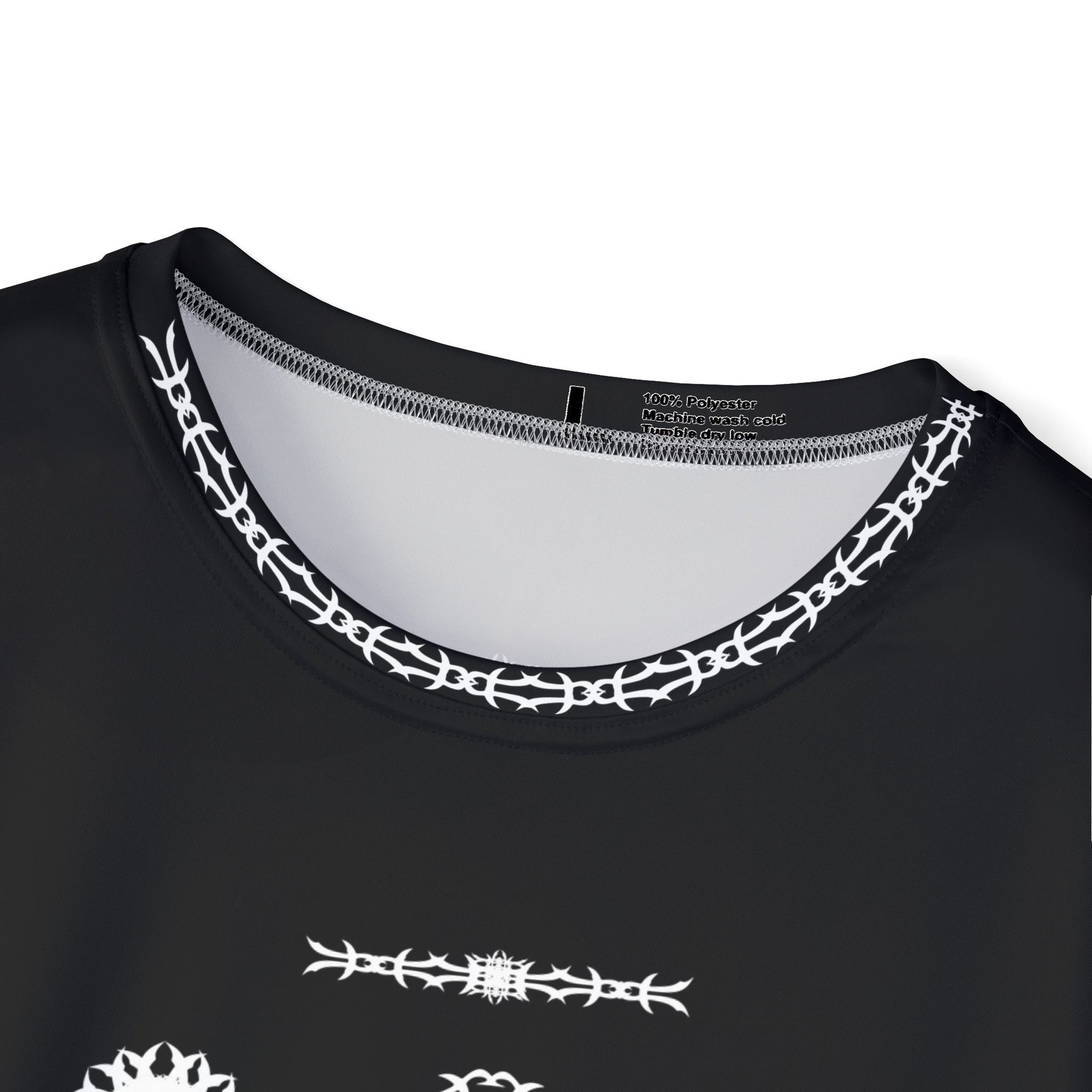 This athletic jersey brings dark, urban edge to active days. Lightweight, quick-dry fabric keeps movement easy and sweat off the skin, while the bold black field and stark white emblem-style motifs create a striking, streetwise look. Wear it to training, a pick-up game, or when you want a sporty layer that reads more like a statement — breathable, resilient, and built to keep its shape through repeat wear. The ribbed collar and armholes stretch on, then snap back for a tidy fit. Finished with clean printed labels and matched seam threads for a polished feel.