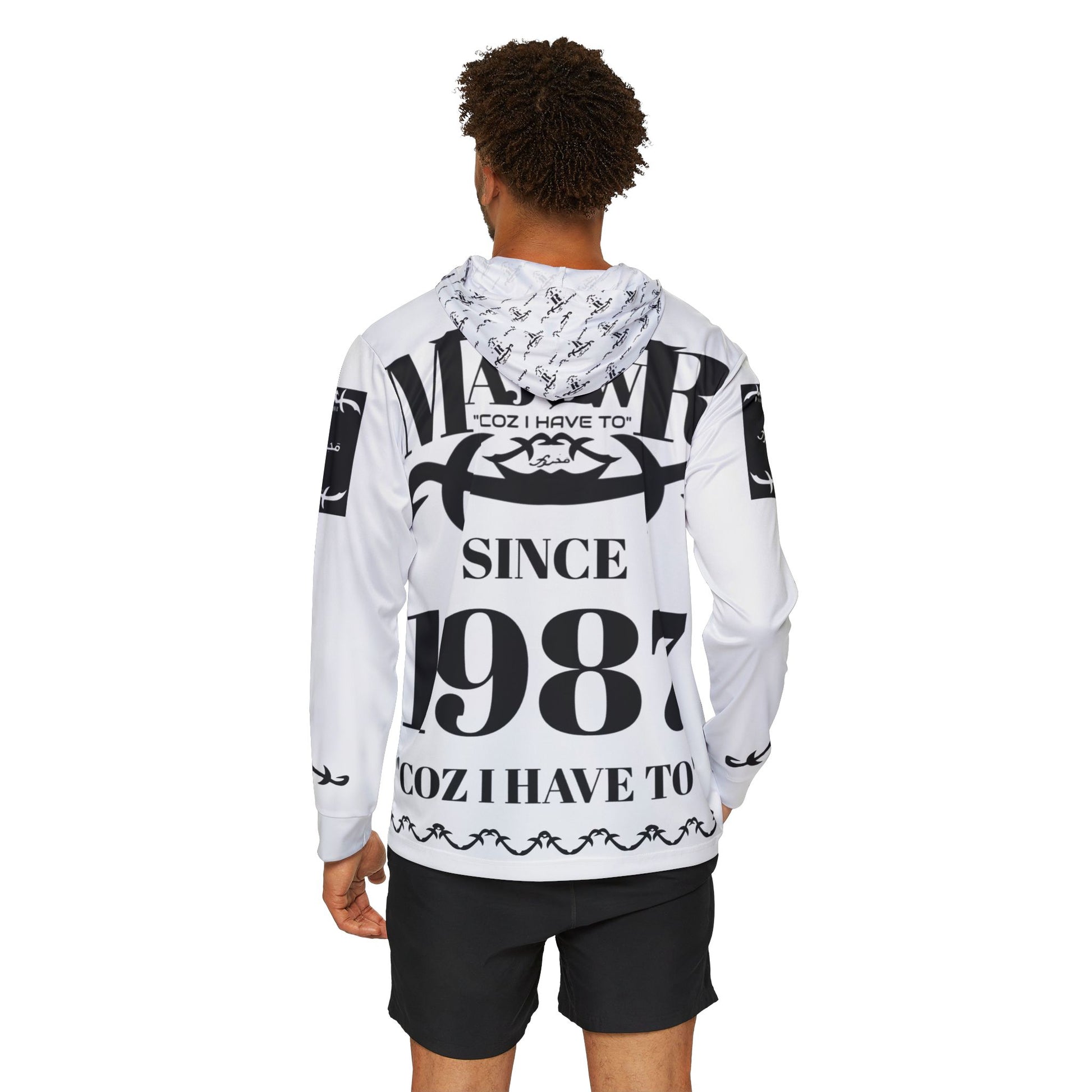 Lightweight, performance-driven hoodie built for movement and everyday wear. The breathable, moisture-wicking polyester keeps you dry through warmups, dawn runs, or long travel days, while UPF 50+ fabric shields skin from harsh sun. Clean white panels showcase bold black graphics and typography that read like a personal banner — a statement layer that sits comfortably under a jacket or stands alone on cooler mornings. Feels airy and fast; wears like an active layer designed to move with you.