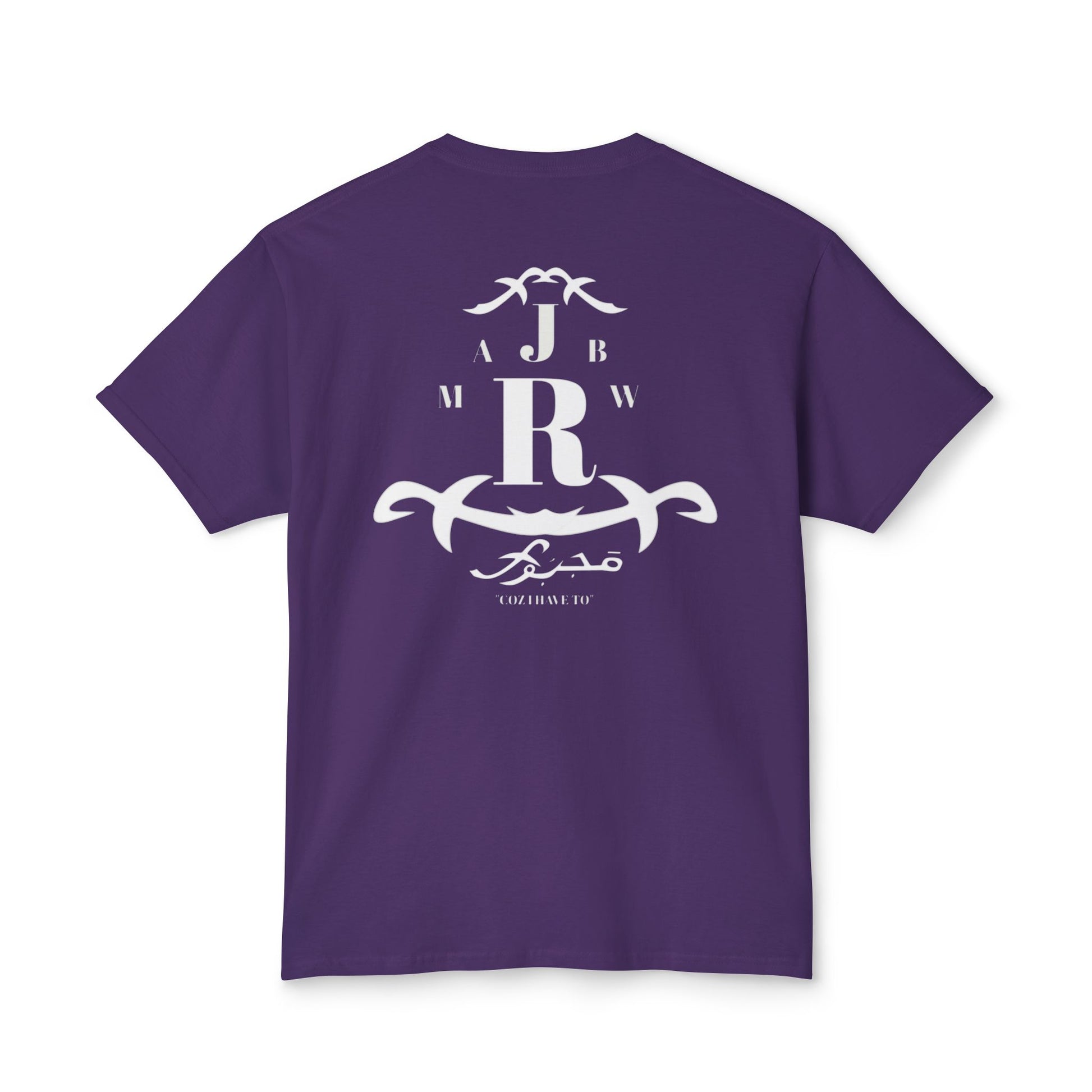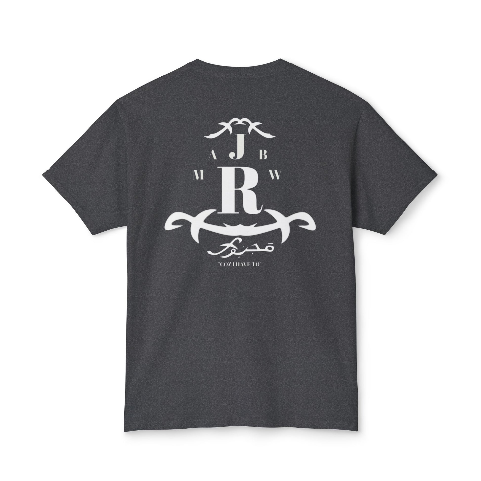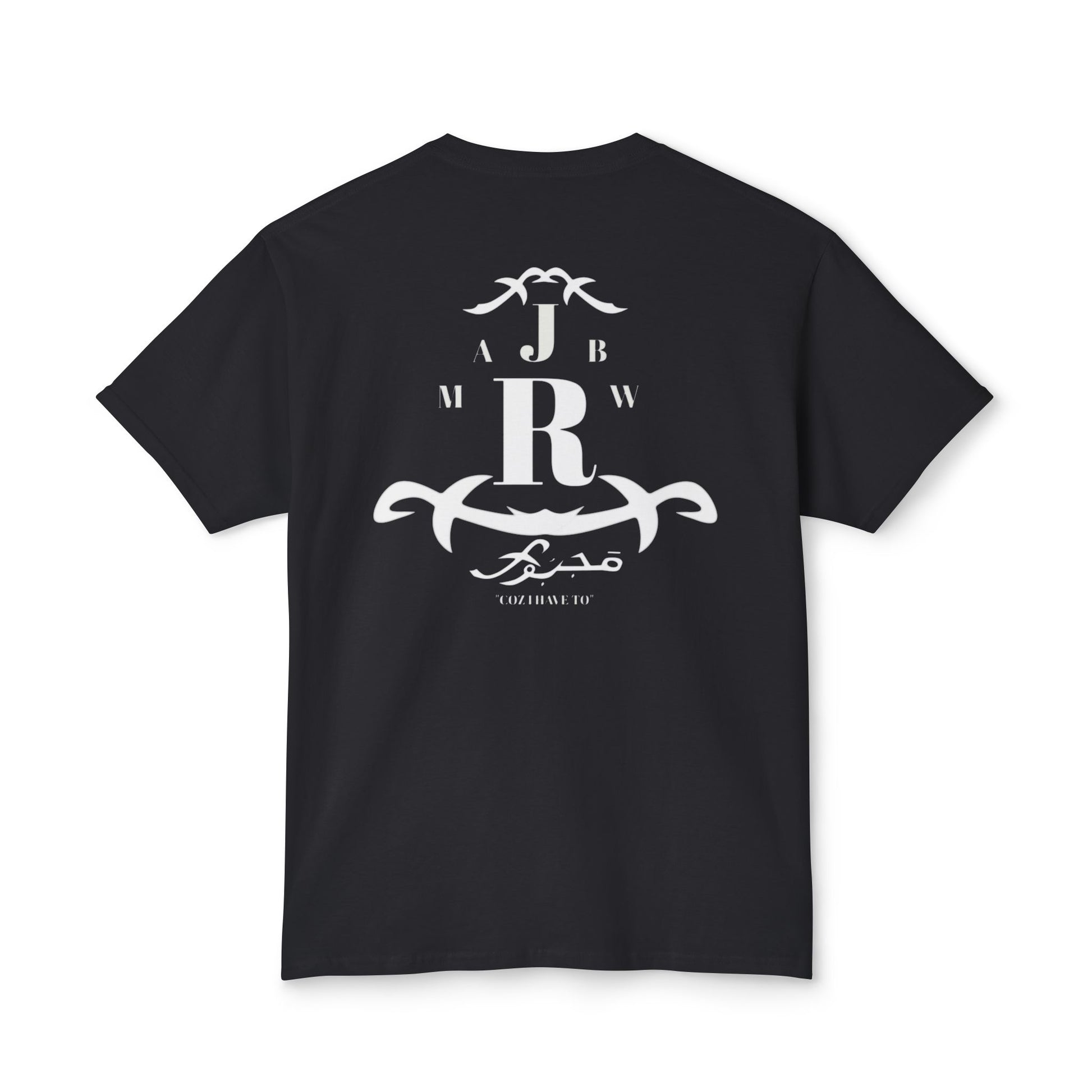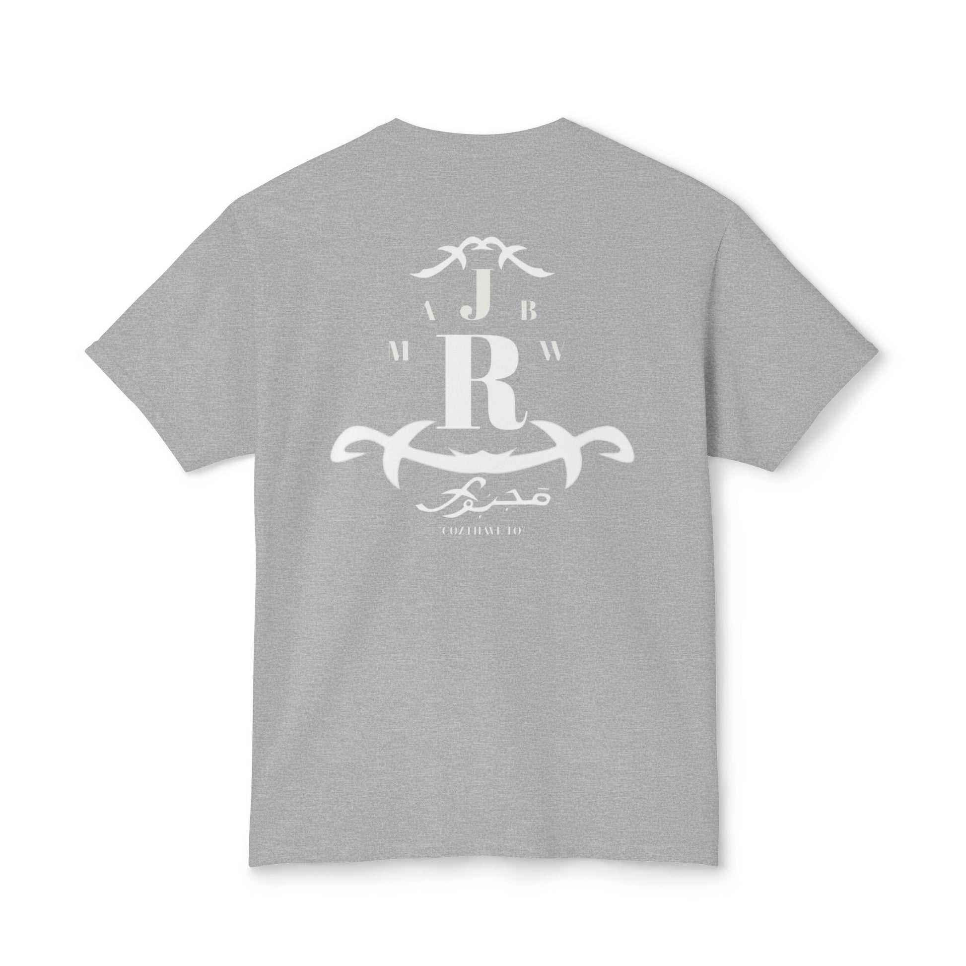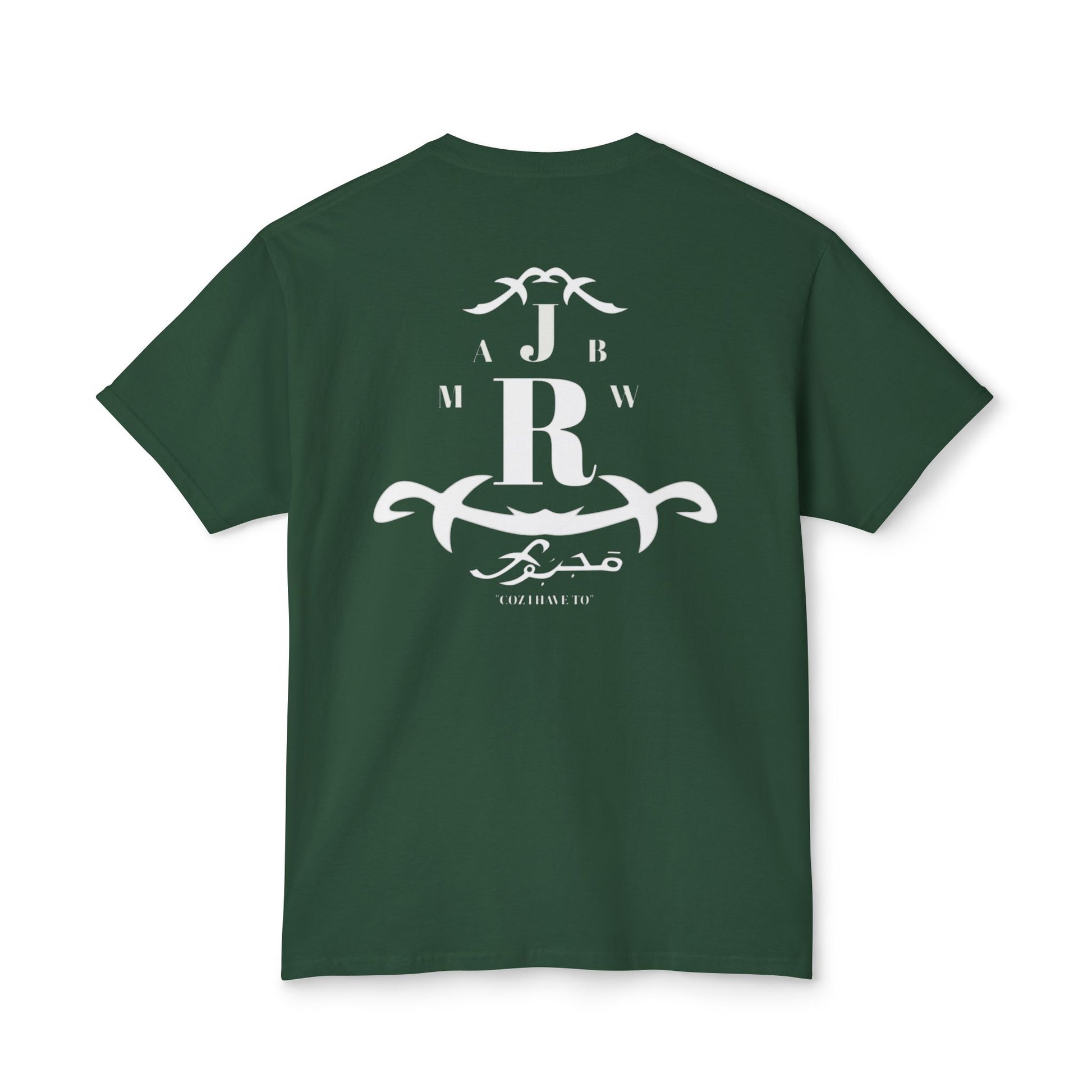 A soft, classic tee with a quiet vintage crest printed in faded white. The emblem mixes bold monogram letters with ornamental scrollwork for a lived-in, heritage feel — like a well-worn family crest or a favorite lodge logo. It sits low-key on the chest and repeats in a slightly larger, centered layout on the back, so the shirt reads like a soft announcement: casual authority, not loud branding. Lightweight fabric drapes easily and breathes on warm days, while the ribbed collar and reinforced shoulder tape keep the silhouette neat after repeated wear. Wear it with faded jeans, a canvas jacket, or layered under open flannels for slow weekends, road trips, and evenings by a fire.