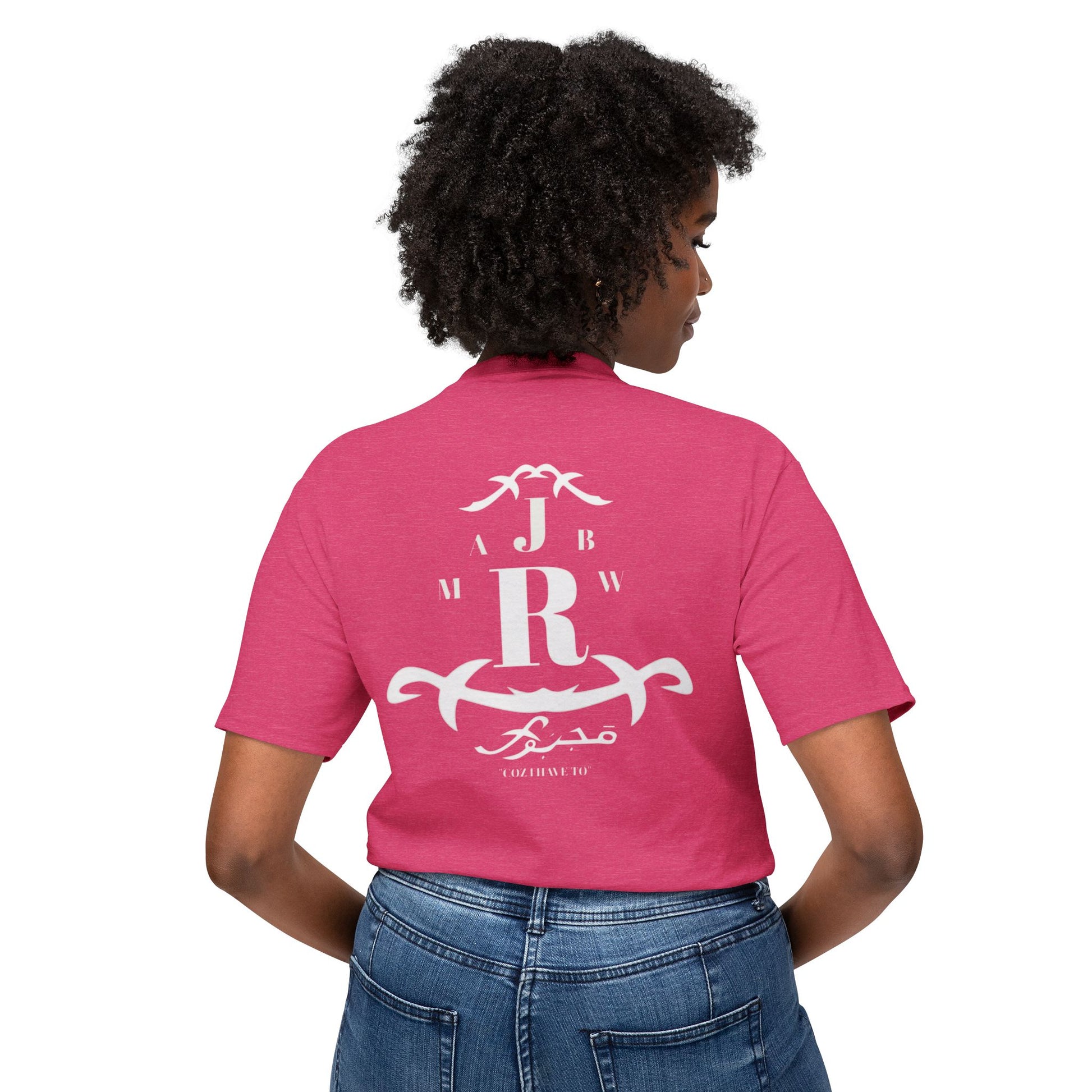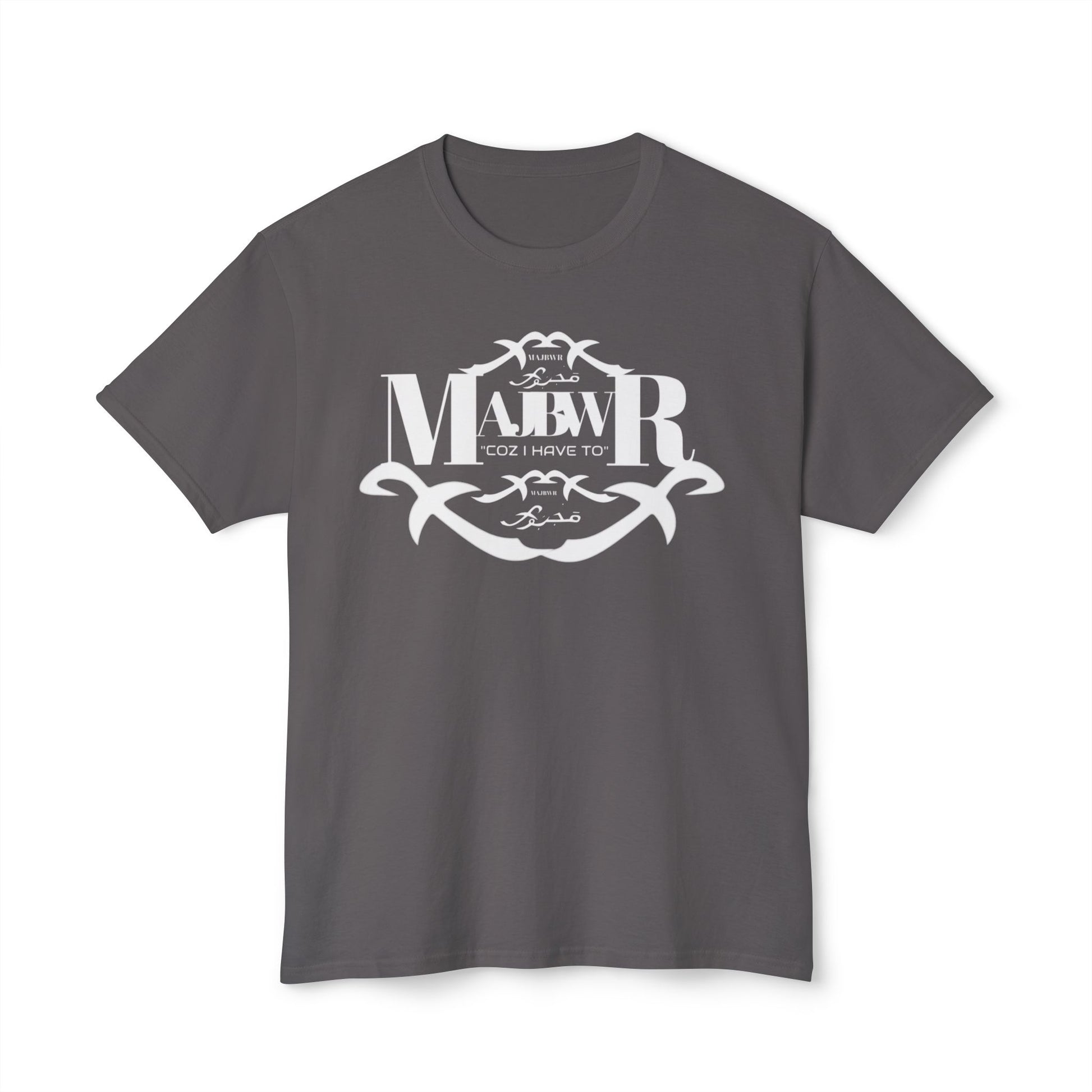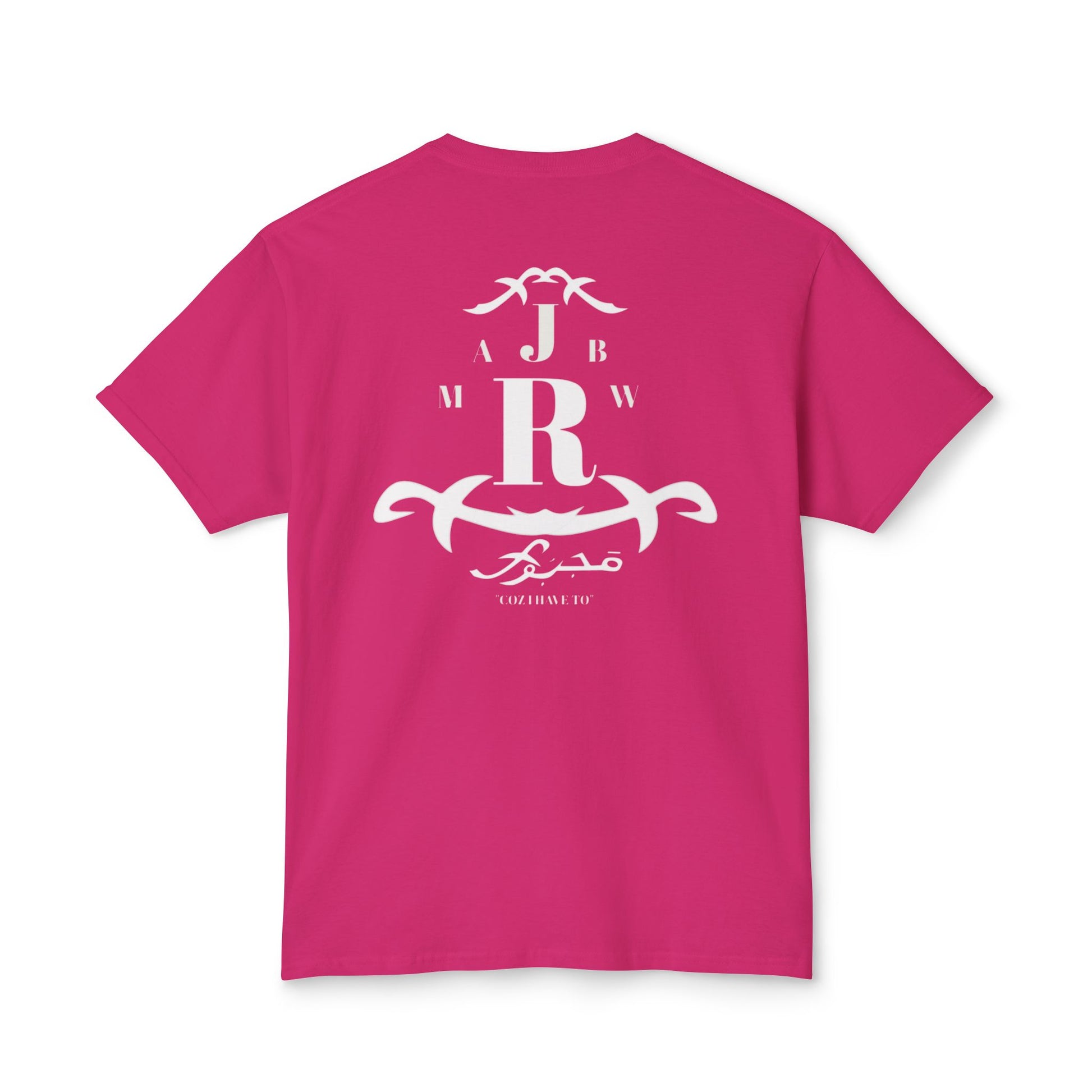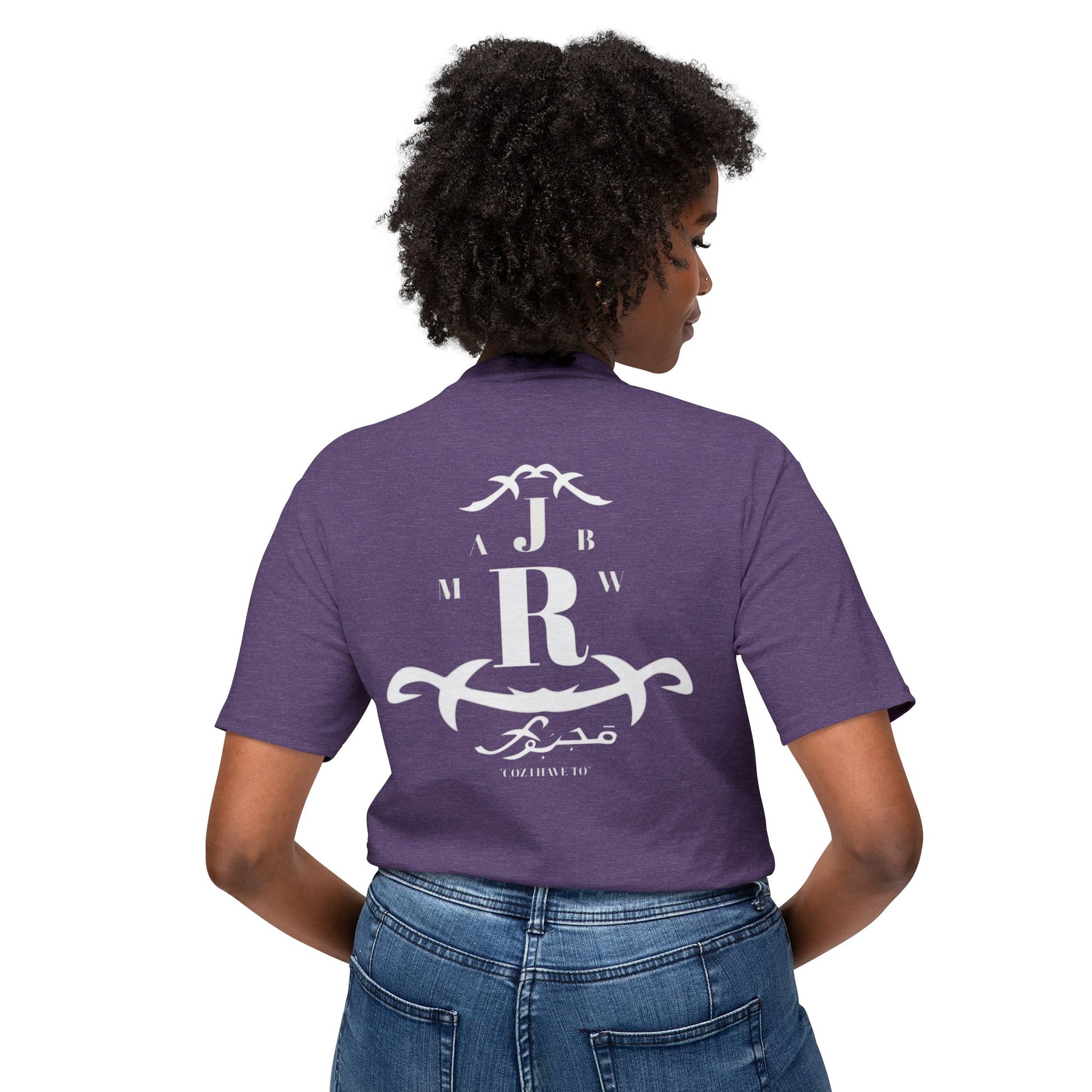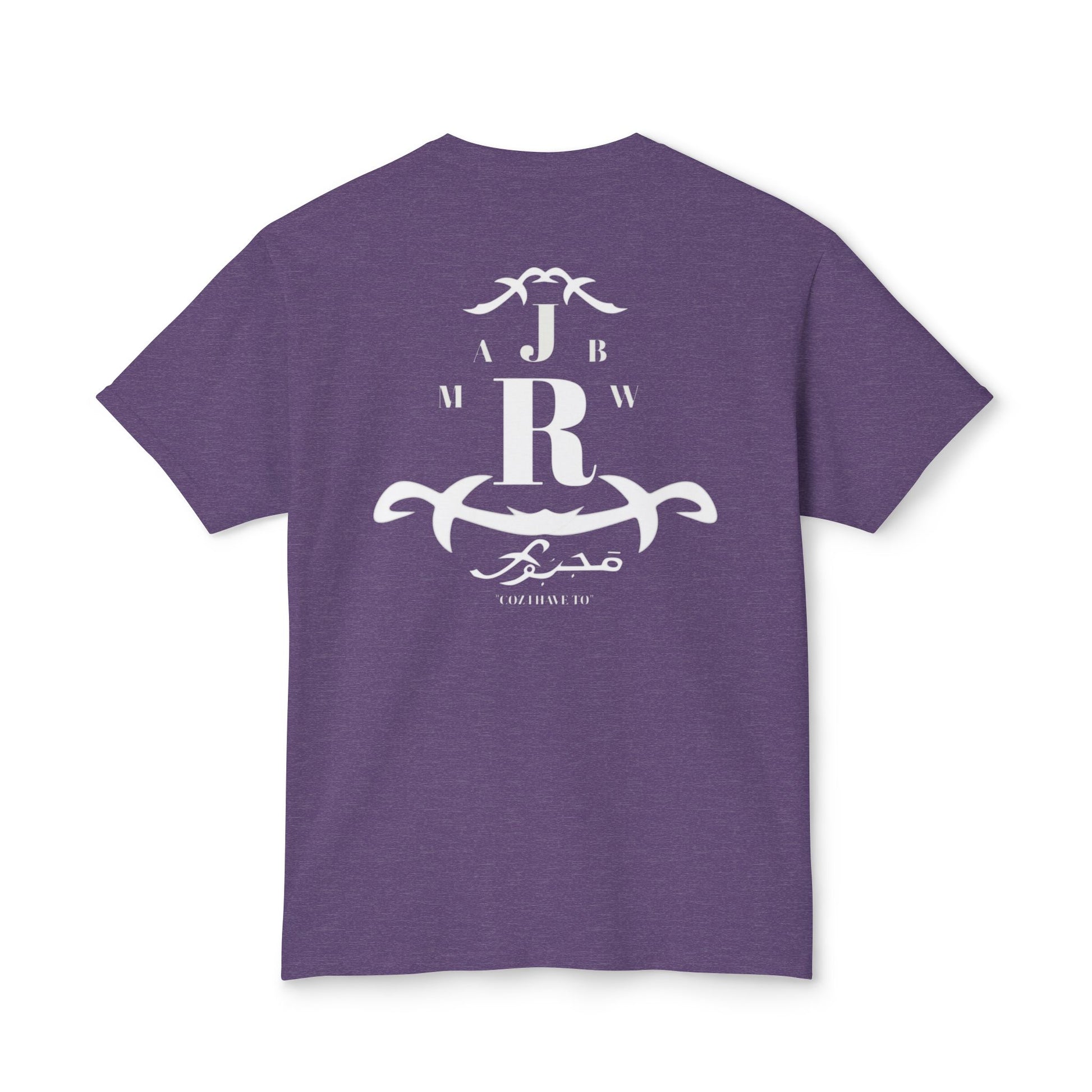A soft, classic tee with a quiet vintage crest printed in faded white. The emblem mixes bold monogram letters with ornamental scrollwork for a lived-in, heritage feel — like a well-worn family crest or a favorite lodge logo. It sits low-key on the chest and repeats in a slightly larger, centered layout on the back, so the shirt reads like a soft announcement: casual authority, not loud branding. Lightweight fabric drapes easily and breathes on warm days, while the ribbed collar and reinforced shoulder tape keep the silhouette neat after repeated wear. Wear it with faded jeans, a canvas jacket, or layered under open flannels for slow weekends, road trips, and evenings by a fire.