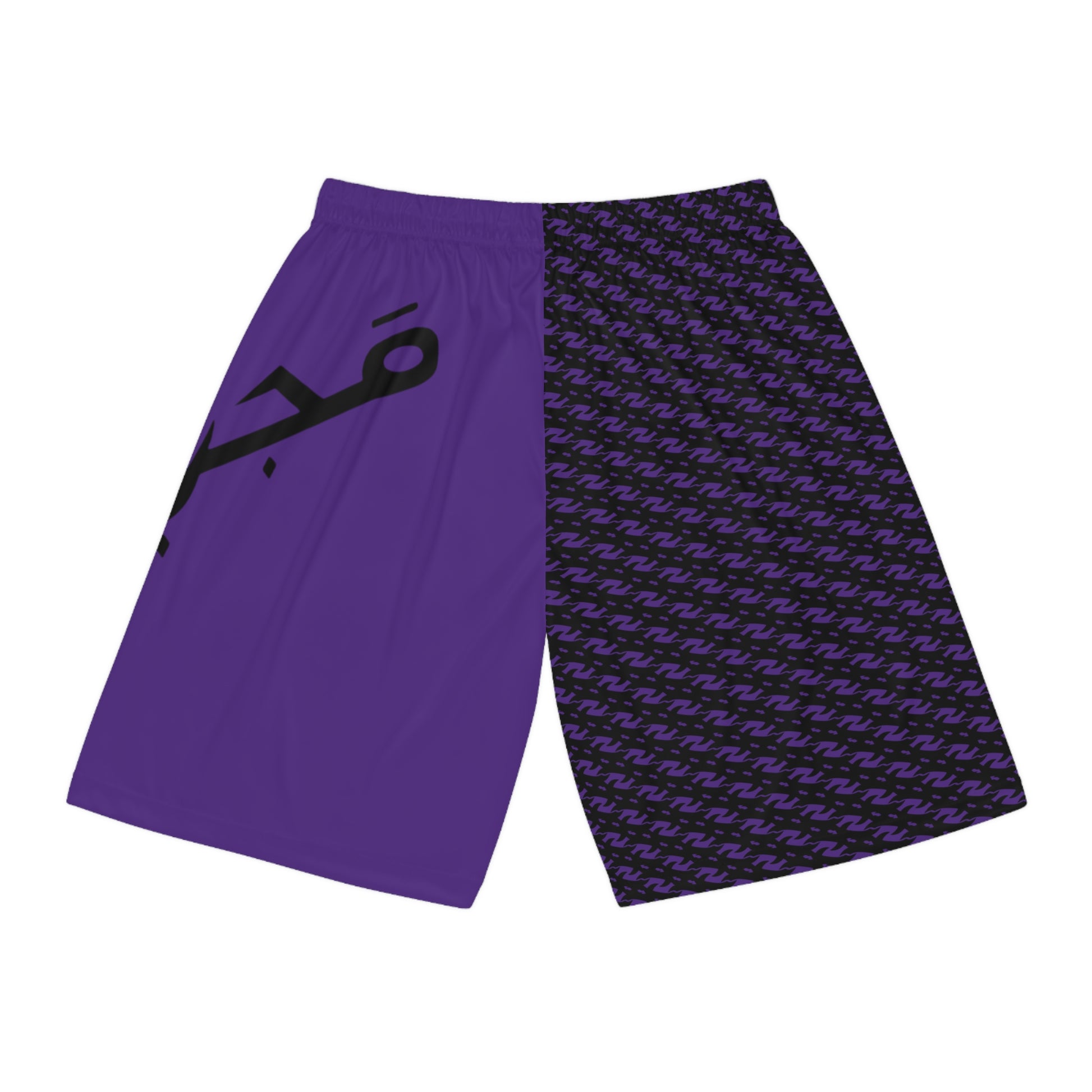 MAJBWR - Purple Split-Panel Basketball Shorts with Script Logo — Athletic AOP Sports Shorts
