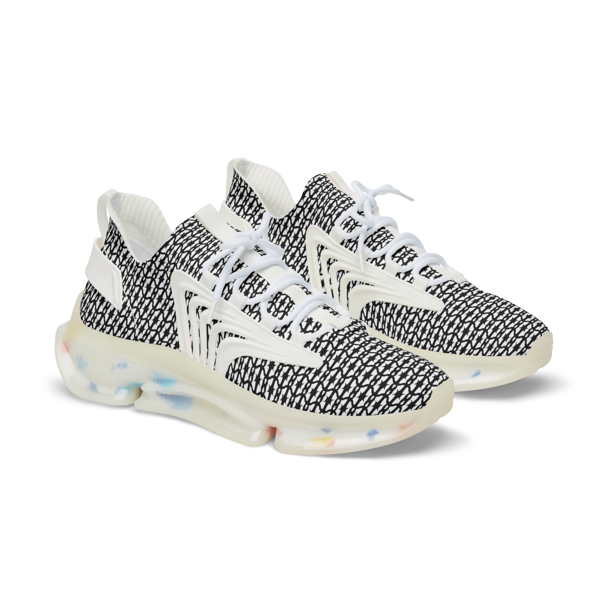 These mesh sneakers bring street-ready attitude with lightweight comfort. The breathable knit upper is wrapped in an all-over monochrome print that reads like modern graffiti — bold, chaotic, and confident. A cushioned EVA sole with visible TPU/EVA shock layer keeps steps springy, while the deodorant memory foam insole breathes and molds to your foot for long days on the move. KPU overlays add weather-resistant structure at stress points, and a secure lace-up closure keeps the silhouette snug. Choose black or white detailing to match your wardrobe; contrast stitching aligns with the sole color for a finished look. They wear like sneakers built for urban exploration, late-night runs, and days when style matters as much as stride.
